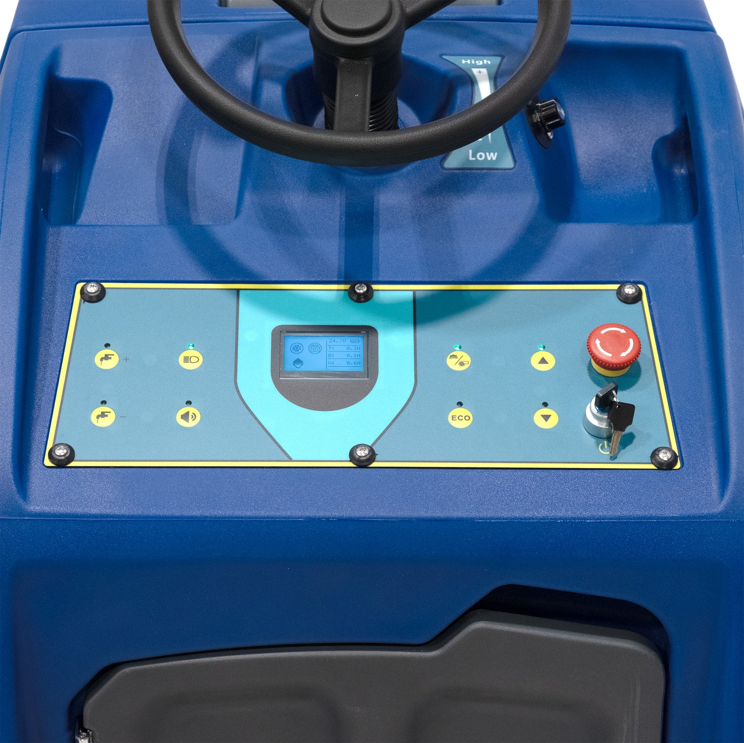 The Stand-On 28 is designed with classic analog controls that are conveniently positioned for quick access and clear visibility. Its durable cockpit is user-friendly, straightforward to operate, and easy to master. Key features include a key switch for powering the machine on and off, dedicated controls for the brush and vacuum motors, and a speed selector for optimal performance.