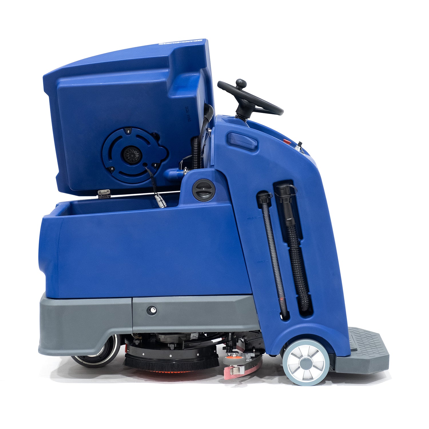 With its 28-inch cleaning path, powered by a dual-brush system (each brush boasting a 14-inch diameter), the Scrubo ensures optimal performance in fewer passes. The innovative stand-on platform minimizes operator fatigue, enabling comfortable and sustained operation during long shifts.